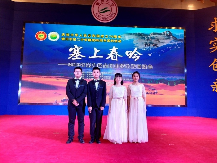 5月25日,第九届全国中学生校园诗会在银川二中拉开了帷幕,我校高一年级学生张思彤、张玳嘉、韩锐和八年级学生高源在语文教师刘燕的带领下参加了此次全国中学生的诗歌盛会。