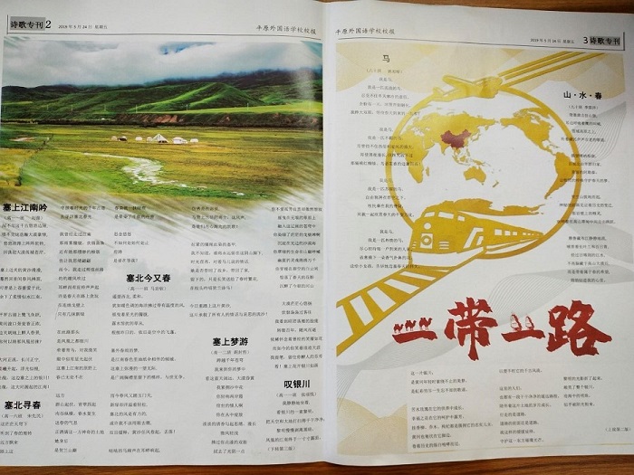 我校入选此次诗会的学生作品还有五首,分别是高一(1)班马岩钦的《塞北今又春》和刘源的《塞上江南吟》、高一(6)班宋先民的《塞北寻春》、高一(2)班胡封哲的《 塞上梦游》、八(10)班姚雨晴的《马》,我校入选的师生作品将由主办方统一结集,并公开出版。